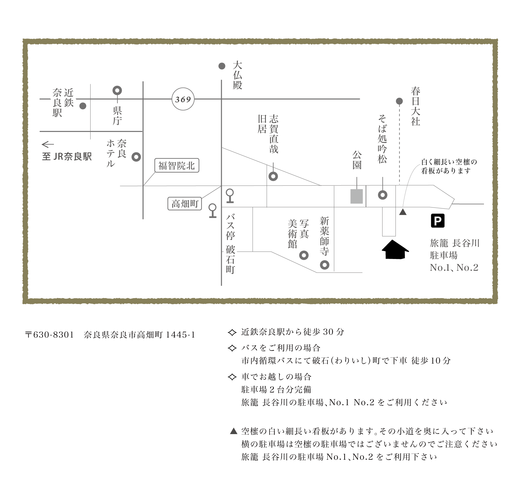「ささやきの小道」は、上の地図の「春日大社」から出てる点線ですかね。ちょうどお店の入り口近くに出るんです。