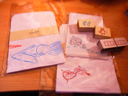 あと、展示でご好評だったビックイカとタコを純白袋に押してみました。裏にもぐるっと押してます。めでたい感じ。500円くらいです。