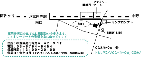 【行き方】高円寺南口を出て左(新宿方面)に線路沿いに歩きます。ファミリーマートの看板を見つけたら右に曲がってすぐ。
