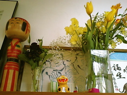 ただいま我が家でこけしの隣、尊敬する絵師ささこさんのてぬぐいと張り子に囲まれて、生けさせていただいております。
